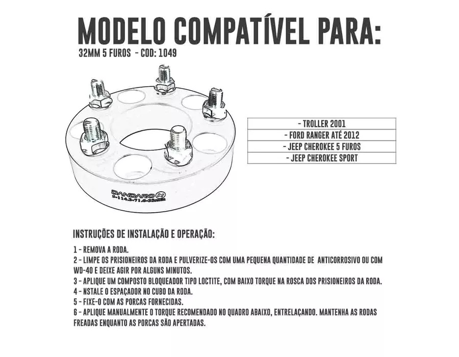 Alargador / Espaçador de Roda 32mm Furação 5x114,3 Cherokee Sport, Troller até 2001, Ranger Antiga Fabricado em Alumínio Especial Anodizado Preto. 32 mm - fabricado em alumínio - pesam 70% menos que os de ferro. Porcas e parafusos acompanham a peça. Foto meramente Ilustrativa - Valor do Jogo com 4 peças INSTRUÇÕES DE INSTALAÇÃO E OPERAÇÃO A Falta de cuidado e/ou negligencia na instalação e operação deste produto pode causar graves ferimentos e / ou sérios danos aos veículos leia e entenda todas as instruções de montagem e operação antes de instalar e utilizar este produto. - Macaco e Cavalete -Chave de torque -Chave de boca 1 -Remova a roda. 2 - Limpe os prisioneiros da roda e pulverize-os com uma pequena quantidade de anticorrosivo ou com WD-40 e deixe agir por alguns minutos. 3 -Aplique um composto bloqueador tipo Loctite , com baixo torque na rosca dos prisioneiros da roda. 4 -Instale o espaçador no cubo da roda. 5 -Fixe-o com as porcas fornecidas. 6 Aplique manualmente o torque recomendado no quadro abaixo , entrelaçando . Mantenha as rodas freadas enquanto as porcas são apertadas. 7 -Remonte a roda nos prisioneiros do espaçador usando as porcas originais do veículo. 8 -Aplique o torque especificado pelo fabricante.